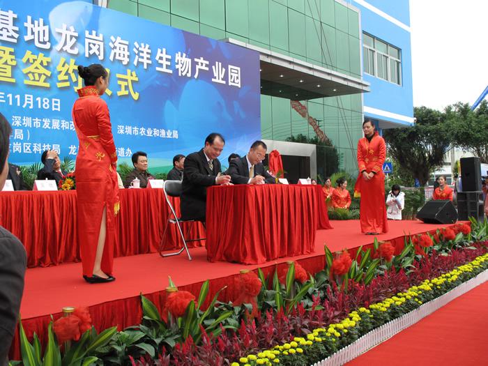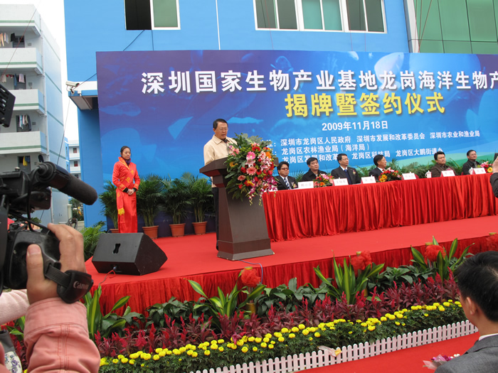 2009年11月18日,深圳國家生物產(chǎn)業(yè)基地龍崗海洋生物產(chǎn)業(yè)園揭牌暨項(xiàng)目簽約儀式在園內(nèi)隆重舉行,中科院院士倪嘉纘,美國工程院院士王兆凱,深圳市副市長李銘,龍崗區(qū)區(qū)長張備、副區(qū)長熊小平等參加了揭牌和簽約儀式